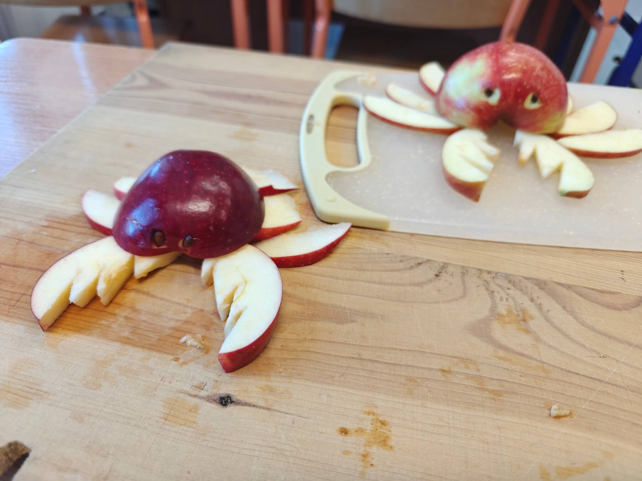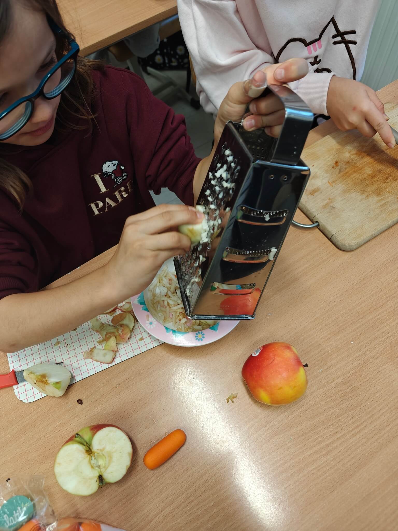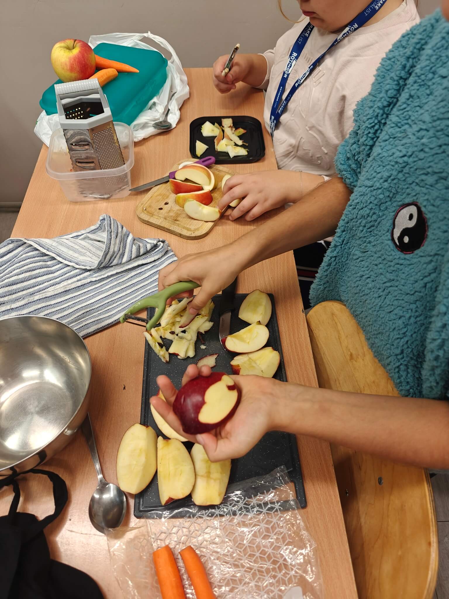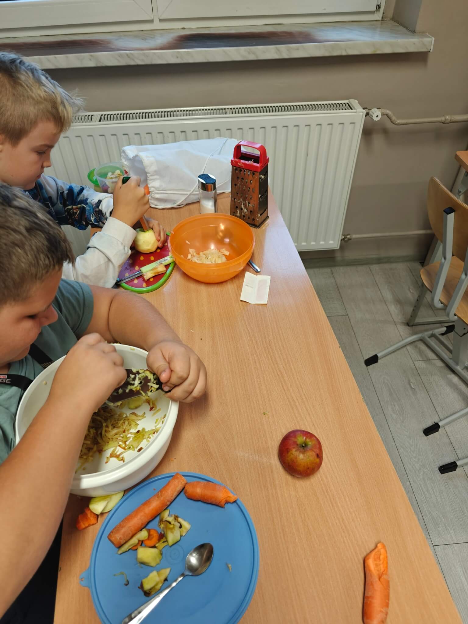 Nie zabrakło także części praktycznej – na lekcjach edukacji zdrowotnej uczniowie wspólnie przygotowywali zdrowe przekąski z jabłkiem w roli głównej. Były surówki, pieczone jabłka i przekąska z jabłka wyciętego w finezyjne kształty. Dzięki temu każdy mógł przekonać się, że jabłko to nie tylko smaczny owoc, ale także doskonały składnik różnorodnych potraw.