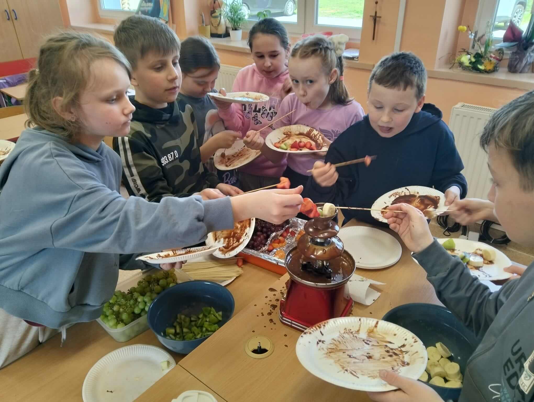 Na zakończenie tego wyjątkowego dnia uczniowie przygotowali czekoladowe szaszłyki. Uczniowie zanurzali owoce w czekoladowej fontannie, co sprawiło im ogromną przyjemność. Rozmawiano przy tym o walorach zdrowotnych kakao oraz jak powstaje czekolada.