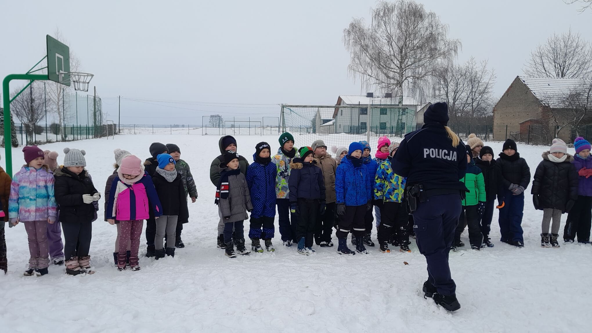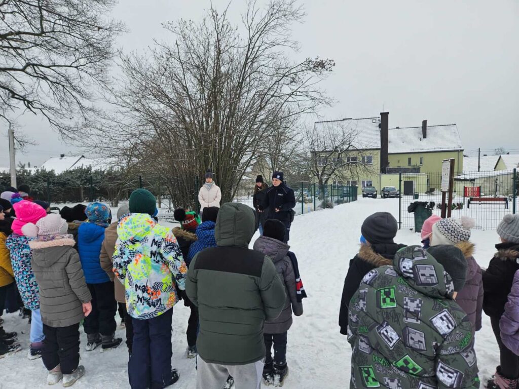 Priorytetem było przypomnienie uczniom, jak można bawić się w śniegu z innymi, by nie zrobić sobie krzywdy. Ważnym zagadnieniem były zamarznięte stawy i jeziora, na które nigdy nie można wchodzić nawet, gdy wydaje się, że lód jest wystarczająco gruby. Pani Justyna Hamela rozmawiała również z dziećmi o podstawowych zasadach bezpieczeństwa w ruchu drogowym, podkreśliła ważną rolę elementów odblaskowych, które każdy uczeń powinien posiadać.