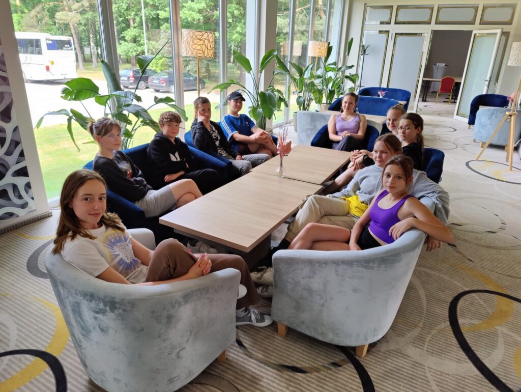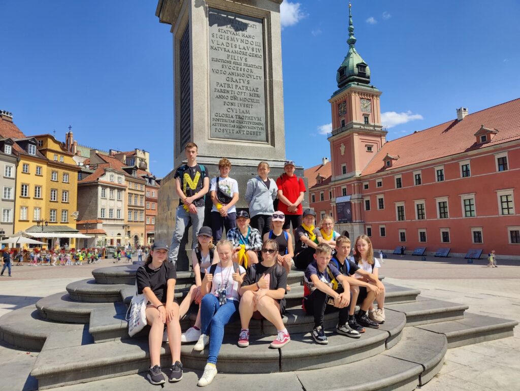 Z Warszawą przywitaliśmy się na Placu Zamkowym, ponieważ tam, pod Kolumną Zygmunta III Wazy, czekaliśmy na przewodniczkę. Wyruszyliśmy z nią na zwiedzanie miasta. Odwiedziliśmy Bazylikę Archikatedralną Świętego Jana Chrzciciela, dzwon na Kanonii, Rynek Starego Miasta, Barbakan, Pomnik Małego Powstańca, ulicę Krakowskie Przedmieście, skwer Adama Mickiewicza, Pałac Prezydencki, Bazylikę Świętego Krzyża, pomnik Mikołaja Kopernika i Grób Nieznanego Żołnierza, przy którym widzieliśmy zmianę warty. Po tym intensywnym zwiedzaniu pożegnaliśmy się z naszą przewodniczką i mieliśmy okazję odpocząć podczas przejażdżki metrem. Większość z nas pierwszy raz podróżowała tym środkiem transportu, więc było to dla nas nie lada przeżycie. Ze stacji metra udaliśmy się do Muzeum Powstania Warszawskiego, gdzie dowiedzieliśmy ciekawych faktów o Warszawie podczas II wojny światowej. Przeszliśmy repliką kanałów i poczuliśmy się jak bohaterowie lektury Galop ’44. Po zwiedzeniu muzeum udaliśmy się autokarem do galerii handlowej Złote Tarasy, która wywarła na nas wrażenie swoim rozmachem. Po tylu doświadczeniach marzyliśmy już o odpoczynku w hotelu. Autokarem udaliśmy się do Leśnej perły w Nadarzynie pod Warszawą, gdzie czekała na nas pyszna obiadokolacja.